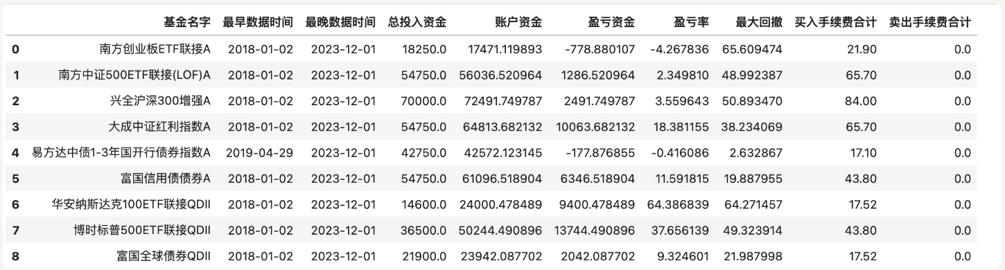 对于数据,我自己写了一份回测的代码,2018年01月开始至2023年12月,初始资金1万元,每期投入5000元,现有的方案总投入资金:368250.0, 账户资金:412668.77, 盈亏资金:+44418.77, 盈亏率:+12.06%,买入手续费合计:377.03,卖出手续费合计:0.0,整体上属于美股一路高歌,A股一路低沉: