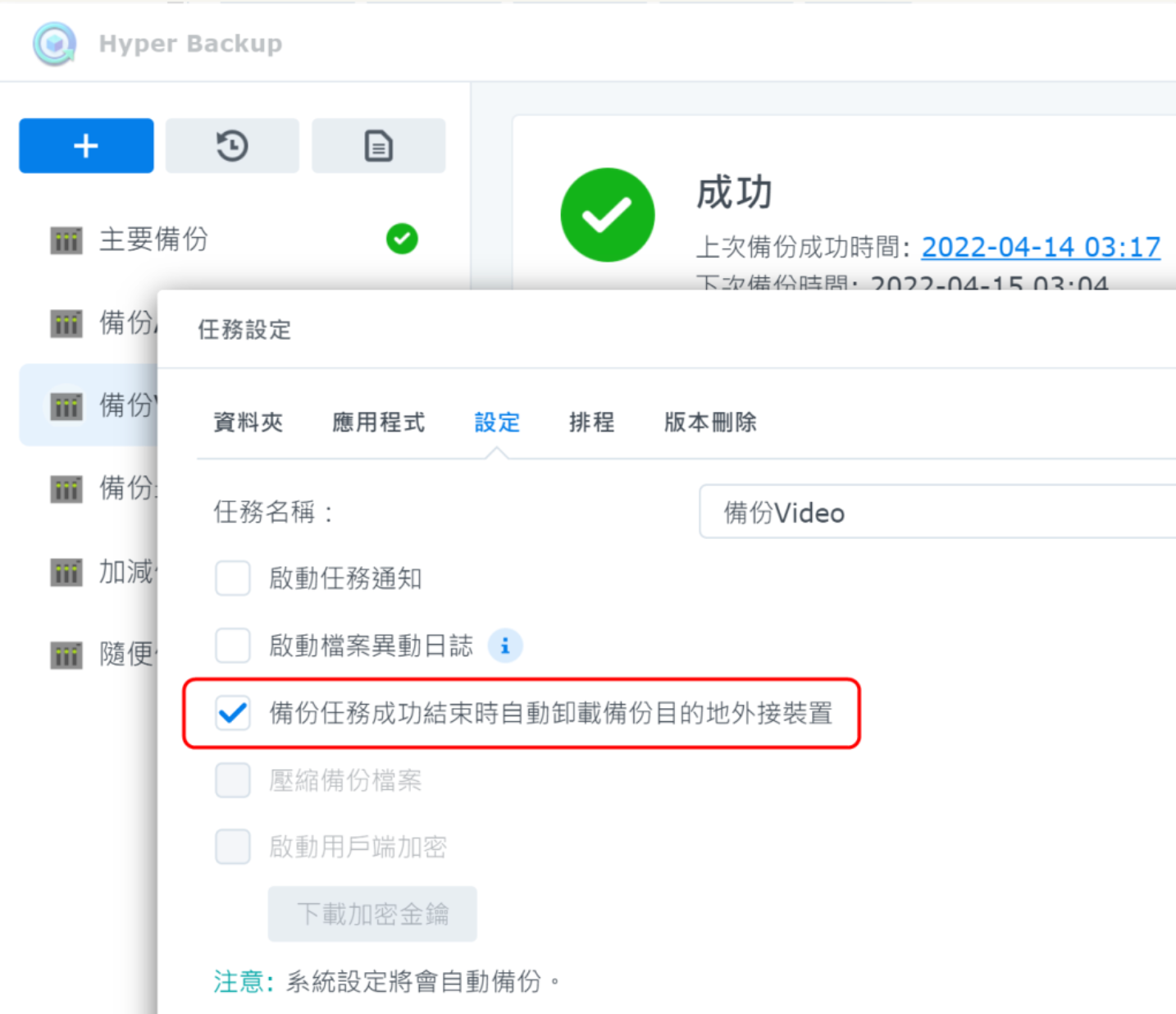 为什么说省电呢?在设置为USB为备份目的地的时候,配置可以选择,当备份完成后自动断开卸载USB,然后再加上硬盘盒的自动休眠,就可以在备份完成后的耗电降到最低,比如下图(因为我目前已经设置完成,所以找不到这个选项了,就借用了一张图片)。