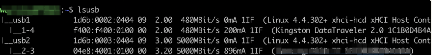 重新挂载USB需要两个步骤,第一个步骤确定USB编号,需要打开群晖的SSH,然后进入到终端后使用lsusb命令,我找到我备份目的地的硬盘为2-3:
